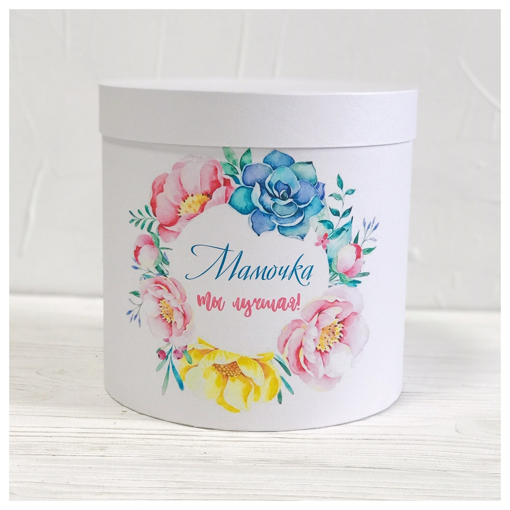 Гарна кругла подарункова коробка для мами з малюнком "Матуся ти найкраща". Розмір коробки d=20 h = 20 см.